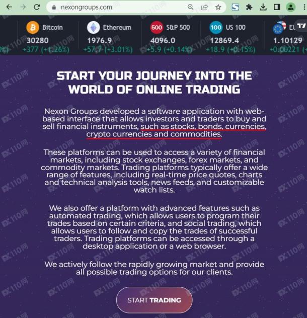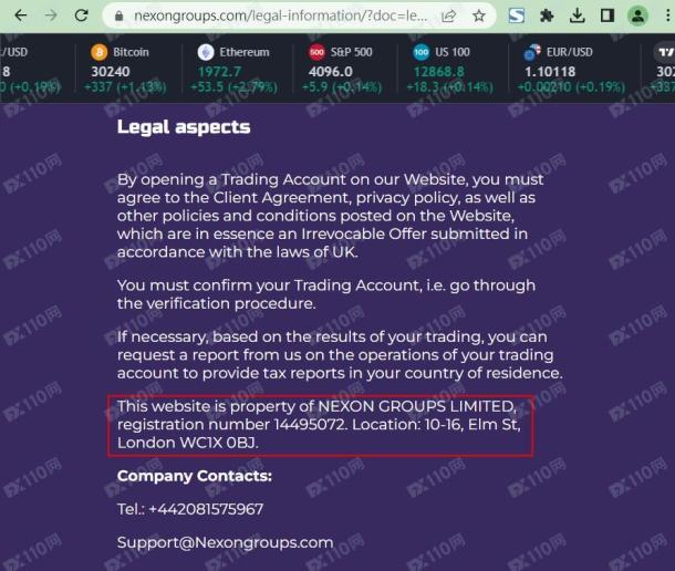 该平台宣称提供外汇、股票、债券、加密货币等交易服务,由NEXON GROUPS LIMITED运营,公司注册于英国,注册号14495072,但未公布监管信息以便用户核实。
